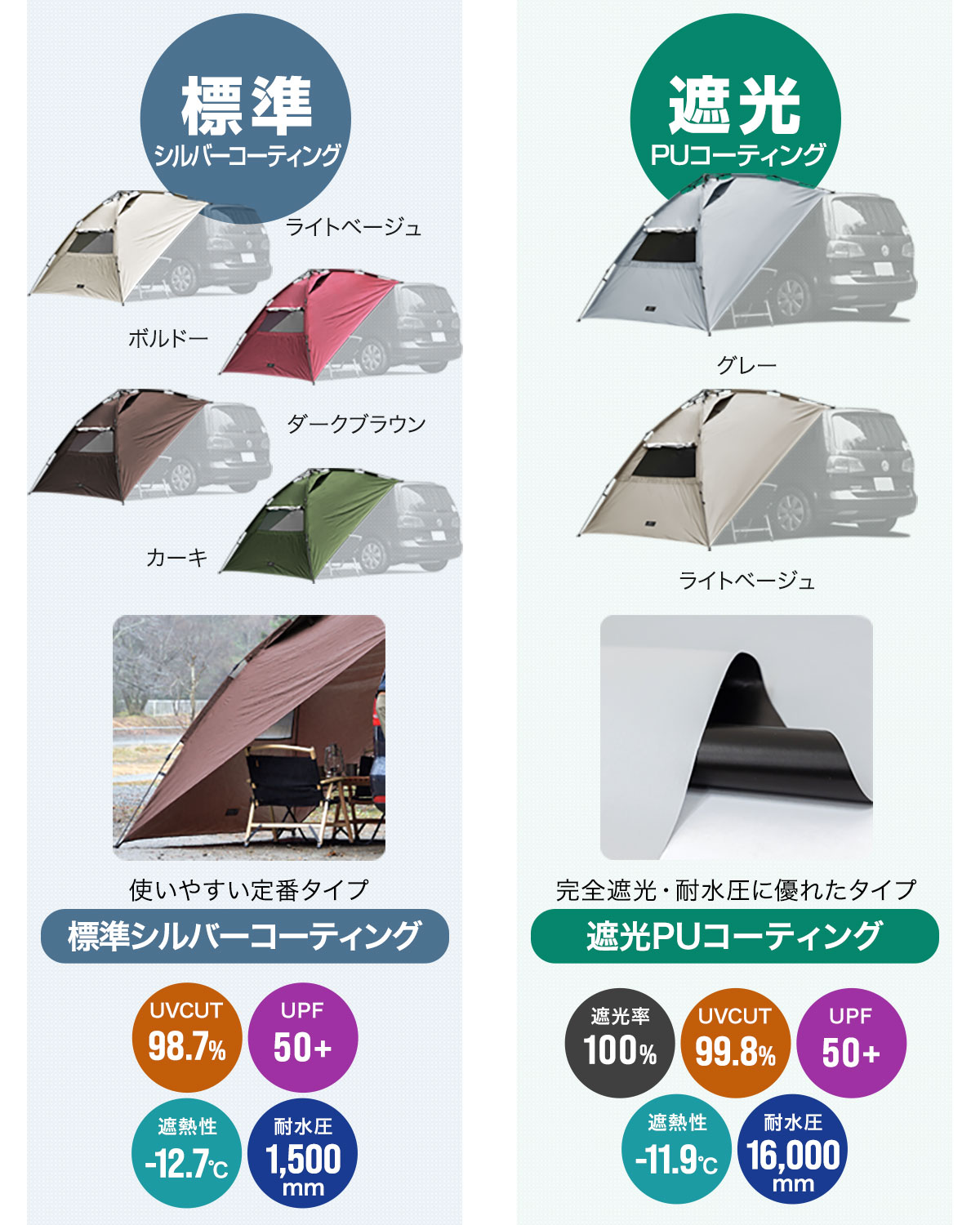 ※[店舗管理用 URL]a12413※[品番]【ライトベージュ/本体セットのみ:a12413】【ボルドー/本体セットのみ:a12414】【ダークブラウン/本体セットのみ:a12415】【カーキ/本体セットのみ:a12416】【ライトベージュ/追加ポール付き(+3,410円):a05619】【ボルドー/追加ポール付き(+3,410円):a05620】【ダークブラウン/追加ポール付き(+3,410円):a05621】【カーキ/追加ポール付き(+3,410円):a05622】 待望のワンタッチタイプが新登場 カーサイドタープにワンタッチ版が新登場!ロープを引くだけでカンタンに設営ができるのでキャンプ初心者から女性にもオススメです。