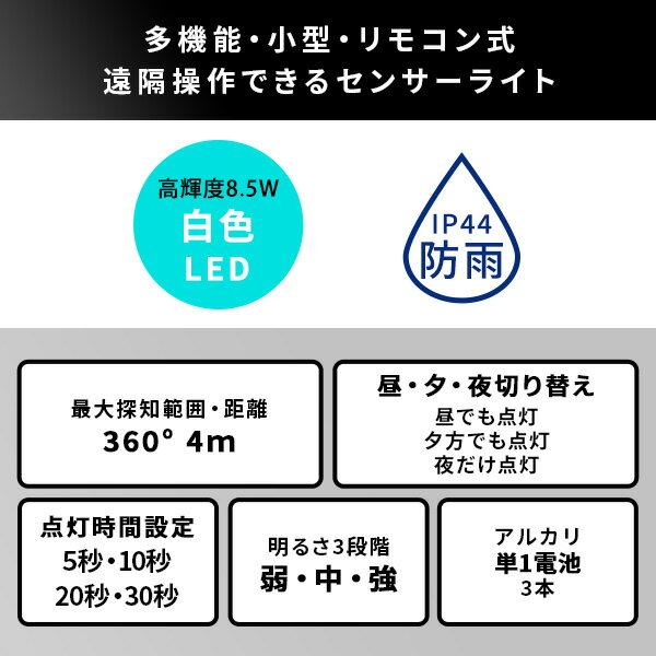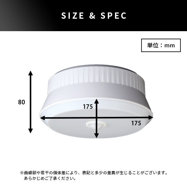 【素材】 電池:単1型アルカリ乾電池×3本(別売) ※市販の単一充電池でも使用可能です 【商品サイズ】 80×175×175mm 【商品重量】 350g 【梱包サイズ】 180×90×190mm 【梱包重量】 599g屋外用センサーシーリングライト【注意事項】メーカー直送の商品となりますので、「代金引換」払いは不可となります。